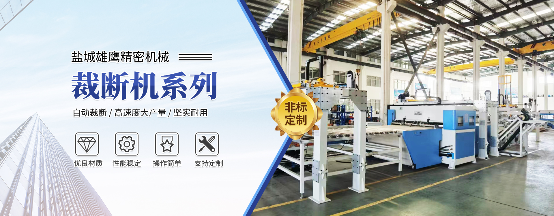 - 主營:"超鷹"牌液壓擺臂下料機、隨動式液壓擺臂下料機、液壓平面下料機、液壓龍門下料機、(旋轉頭)自動送料精密四柱液壓龍門下料機、四柱(精密四柱)液壓平面下料機、上壓板自動后移精密四柱液壓平面下料機等系列產(chǎn)品。